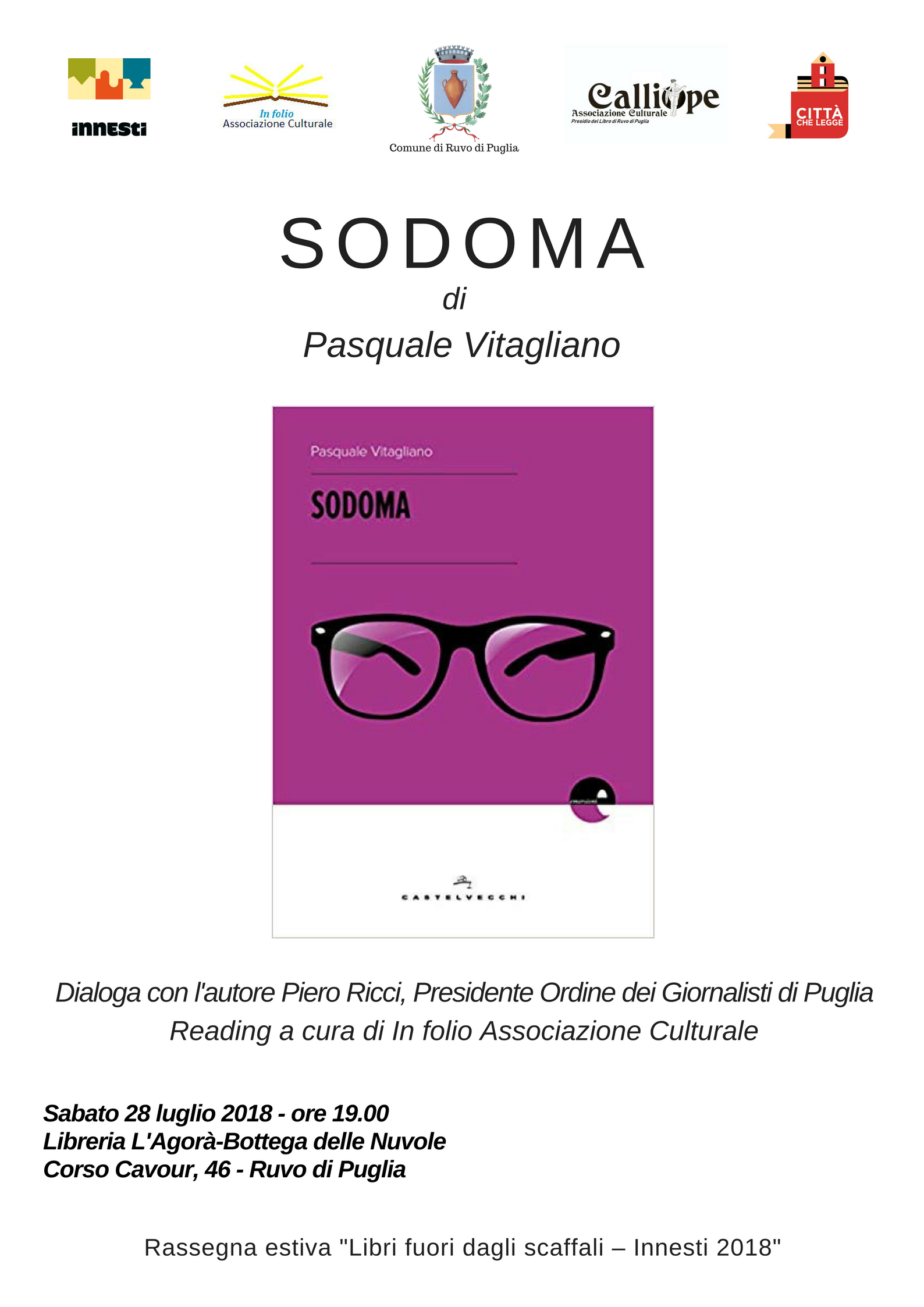 L’associazione culturale Calliope Presidio del libro in collaborazione con In folio Associazione Culturale, con il patrocinio del Comune di Ruvo di Puglia Città che legge Assessorato alla Cultura, nell’ambito di Innesti Estate 2018, presentano Sodoma di Pasquale Vitagliano a Ruvo di Puglia, Castelvecchi editore.