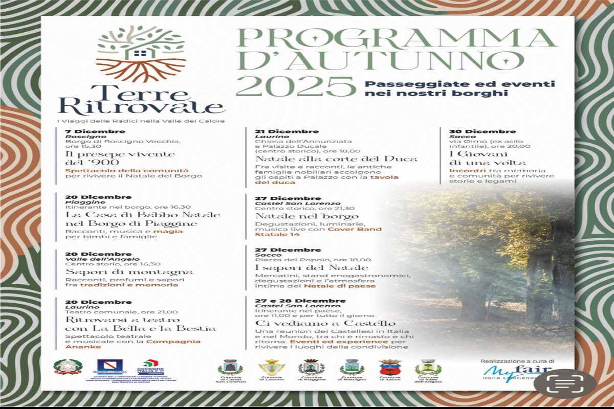 A dicembre i comuni di Castel San Lorenzo, Roscigno, Sacco, Valle dell’Angelo, Piaggine e Laurino si trasformeranno nella location ideale degli appuntamenti culturali legati al Natale, ma soprattutto alle radici, alla memoria, all’identità.