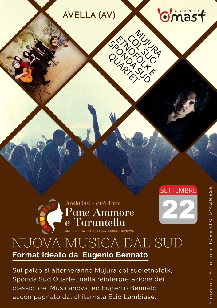“Sponda Sud Quartet” (Letizia D’Angelo soprano, Laura Cuomo contralto, Francesco Luongo, tenore, Edoardo Cartolano, basso) è una ensemble vocale di giovani artisti campani, che ha già avuto modo di essere diretta da Eugenio Bennato (in una formazione più allargata di sestetto vocale dal nome di “Le voci del Sud”) in occasione di “Sinfonia per un Brigante”, concerto in onore di Carlo D’Angiò, e di “Qualcuno sulla Terra – canzoni inedite sulla Natività”. Sponda Sud Quartet ha recentemente riletto ed inciso le storiche composizioni dei Musicanova, fra cui “Canto allo scugnizzo, “Vento del sud” e “Pizzica minore”. Mujura, voce & chitarra acustica, sarà accompagnato da Salvatore Rainone, batteria & percussioni, Marcello Giannini, chitarra elettrica, Marcello Gentile, mandola, Riccardo Villari, violino, Vincenzo Lamagna, basso & contrabbasso. Mujura è nato a Roccella Jonica nel 1979. Dopo l’esperienza con Taran Khan, dal 2004 collabora con Eugenio Bennato, sia come musicista (bassista e chitarrista) che come produttore. Partecipa a tour italiani e internazionali ed è uno dei produttori del brano “Grande Sud”, presentato da Eugenio Bennato a Sanremo 2018. Pubblica il suo primo lavoro omonimo nel 2011. Il videoclip “A crapa” riceve il premio Manente, sezione speciale. Nel 2015 è finalista di Musicultura, vince la targa En Certain Regard come migliore esibizione. Nel 2016 vince la settima edizione di Musica contro le mafie. “Come tutti gli altri dei” è il suo ultimo lavoro discografico, uscito nella primavera del 2018.