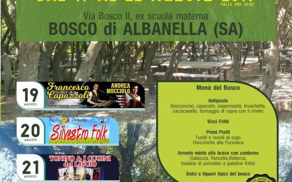 Albanella. Salumi, carni, formaggi locali, pasta di semola di grani antichi e tanto altro ancora. Torna ad Albanella, più ricca che mai, la IV edizione della “Festa del Bosco” dal 19 al 22 agosto, le ricette del bosco tra musica e tradizione.