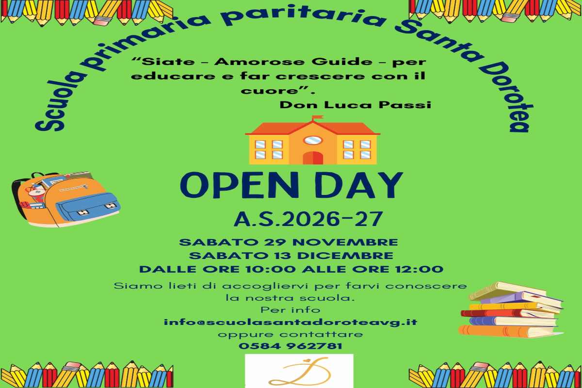 La scuola primaria paritaria “Santa Dorotea” di Viareggio (Via XX Settembre, 39) accoglierà i visitatori sabato 13 dicembre in occasione dell’ultimo open day. Le famiglie interessate potranno esplorare le aule e gli spazi dell’istituto, conoscere il piano formativo, ottenere informazioni su iscrizioni, progetti in corso e novità previste per il prossimo anno scolastico 2025/26. La coordinatrice, le insegnanti e tutto il personale scolastico saranno presenti per illustrare ambienti e attività e per rispondere alle domande dei partecipanti. Gli incontri si svolgeranno dalle 10.00 alle 12.00. La scuola invita inoltre tutti al Christmas Market, in programma mercoledì 17 dicembre dalle 17:00 alle 18:30: un pomeriggio con regali, piccoli lavori artigianali, la possibilità di scattare una foto con Santa Claus e molte altre sorprese.