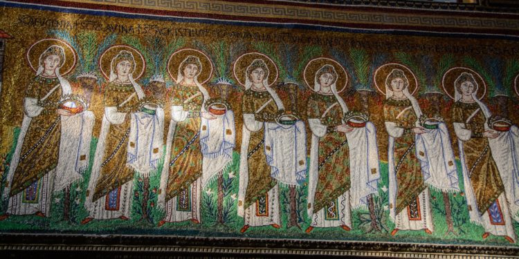 Il gruppo di famiglie alcune complete, altre solo madri o solo padri, una partenza importante per noi adolescenti di circa quindicenni e diciottenni, diretti in una diversa località per una gita importante, proposta da un’Agenzia tipicamente culturale, elogiando il nostro prossimo percorso la direttora d’agenzia. Dette diversi depliant da distribuire a tutti i partecipanti alla Gita il suo atteggiamento di donna pronta ad affrontare un’assenza di cinque giorni da casa per seguire noi. Per il nostro gruppo la gita era un ‘occasione per essere qualche giorno spensierate dallo studio.”Visita alla bella città di Ravenna”. Punto d’incontro, tra il realismo nell’arte romana e le nuove espressioni di quella bizantina, Ravenna è uno dei più straordinari centri d’arte del nostro lungo stivale. L’ambiente cittadino è tutto intessuto di architetture ornate di mosaici e sculture, create, tutte nel breve spazio di un tempo trascorso tra i primi decenni (del V e la metà del AVI sec.), tutte in quel breve perimetro della città o appena fuori dalle sue mura. Il battistero degli Ariani (493-526) trasformato in oratorio di Santa Maria in Cosmedin, piccola costruzione a pianta ottagonale. Della decorazione a mosaico è rimasta solo quella che ha la caratteristica di essere in tessere di marmo e non di pasta vetro, come altrove è raffigurato, al centro, il Battesimo di Gesù nel Giordano con attorno, a raggiera i dodici Apostoli. Battistero Neoniano o degli Ortodossi (451-460). La costruzione terminata sotto il vescovo Neone, dal quale deriva il nome, è a pianta ottagonale con quattro absidi sui lati alterni, attualmente il piano pavimentale è tre metri sopra a quello originale e soffoca lo spazio chiuso. Si notano gli splendidi mosaici della cupola che raffigurano, al centro, Battesimo di Cristo, nella fascia sotto gli apostoli e, verso il basso,troni disegni ornamentali e Vangeli. In punta di piedi entriamo nella Biblioteca Classense. Ha sede nell’ex Monastero Camaldolese di Classe, è tra le maggiori e più importanti d’Italia e raccoglie oltre a manoscritti e incunaboli circa trecentomila volumi tra cui il De Oratore di Cicerone. Bellissima scultura di Tullio Lombardo detto Guidarello Guidarelli, il cavaliere in vita, non fu certo fra i più famosi ma doveva,da morto diventare il più amato. La sua statua, scolpita nel 1525, richiama infatti, da tutte le parti del mondo, uno stuolo di visitatrici che gli manifestano con fiori e baci la loro ammirazione mia anima presso la Galleria dell’Accademia, di Ravenna. Galla Placida, Reggente dell’Impero d’occidente, fece erigere questo monumento funebre nel 425-426 per onorare la memoria del secondo marito, Costanzo III, e del fratello Onorio i cui sarcofaghi mirabilmente scolpiti, sono sistemati nei bracci laterali. Un terzo sarcofago senza alcun fregio, al centro, doveva essere destinato a Galla Placida stessa, ma rimase vuoto perché l’imperatrice fu sepolta a Roma, dove morì. Gli stupendi mosaici a brillanti colori, che ricoprono l’interno, sono perfettamente armonizzati con le sobrie e pure linee, delle volte e della cupola. Il progetto dell’intera opera è sicuramente di un solo grande artista, che si avvale di altri solo per la realizzazione. Fregio decorativo, disegni ornamentali incorniciano le raffigurazioni che ricoprono tutto l’interno: festoni di frutta, stelle dorate su fondo azzurro, nastri e fiori. Un motivo a greca che acquista rilievo dalle sfumature dei colori e si stacca dalla parete in un’audace visione di scorcio. La visione dell’interno è un poco danneggiato dalla riduzione dello spazio causata dal pavimento rialzato. Sopra uno zoccolo di lastre di marmo giallo di Siena affiorano, nella magica luce che filtra attraverso le lastre di alabastro delle finestre, i stupefacenti mosaici. La parete sopra il sarcofago di Galla Placida, dove è raffigurato San Lorenzo, con la croce e il libro della Legge, la graticola,simbolo del martirio del Santo. E lo stipo con i quattro Vangeli dei quali Lorenzo, come dicono, era custode. Chiesa dello Spirito santo ( V sec. Antica cattedrale Ariana dedicata a San Teodoro,eretta ai tempi di Teodorico in opposizione alla basilica Ursiana, ortodossa. Rifatta nel XVI, fu restaurata recentemente. All’interno, con belle colonne ornate di eleganti capitelli,un notevole ambone di marmo greco del AVI secolo. Duomo (1743), Eretto dov’era l’antica Basilica Ursiana fondata dal vescovo Orso nel V sec.,ha grande facciata barocca, preceduta dal portico a tre arcate. All’interno,con belle colonne ornate di eleganti capitelli, un notevole ambone marmoreo marmo greco del (VI sec.) con figurazioni interessanti. Ci aspettava una scorpacciata d’arte antica, Visitammo Sant’Apollinare nuovo, l’interno della chiesa è interamente rivestita di mosaici. Sulla parete sinistra della navata centrale, dove si ravvisa rappresentata l’arrivo dei tre Re Magi, Baldassarre, Melchiorre e Gaspare con i tradizionali doni che, guidati dalla cometa senza coda, in un paesaggio orientaleggiante, si affrettano verso la Madonna col Bambino. I tre visi potrebbero rappresentare le tre età dell’uomo: giovinezza, maturità e vecchiaia. La galleria dell’Accademia, raccoglie numerose opere d’arte, soprattutto riferite a pittori romaglioli: N.Rondinelli, E.Longhi, S.Mazzoni, Lorenzo Monaco, Antonio Vivarini, Guercino. Tra le sculture, la più famosa è di certo la statua sepolcrale di Guidarello Guidarelli. Inoltre la sezione contemporanea. Il Mausoleo di Galla Placida inizio V sec. Edificio a croce latina in laterizi,ornato di archetti ciechi. Lo zoccolo del monumento è interrato causa abbassamento del terreno di circa un metro e mezzo e tutto questo danneggia sia la visione esterna sia quella interna, rivestito di mosaici policromi di stupefacente bellezza. Il Museo ha sede nel palazzo Arcivescovile, del ( V-VI) ,ricco di statue,