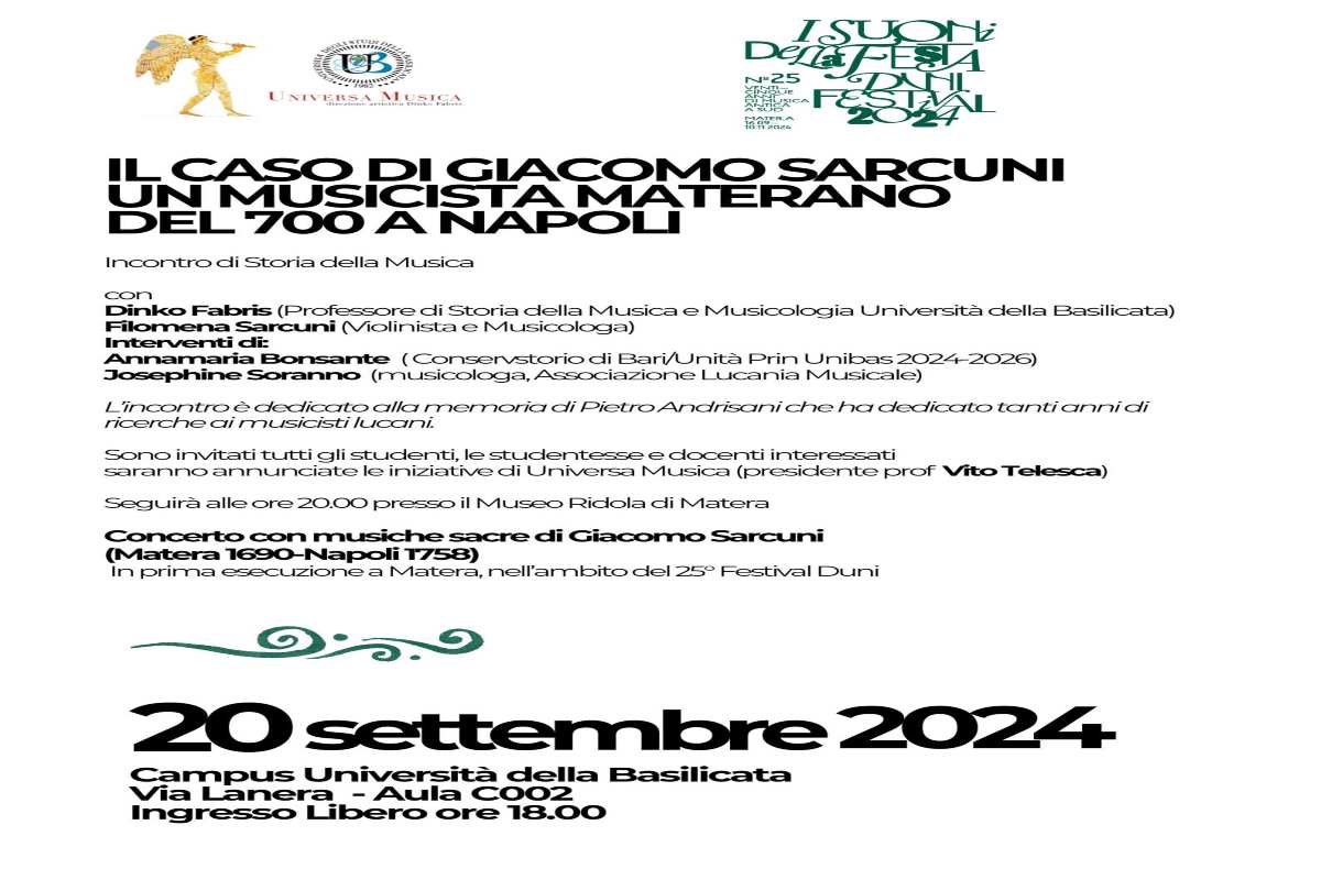 Si terrà venerdì 20 settembre alle ore 18:00 nell’aula C002 del Campus dell’Università della Basilicata in via Lanera a Matera l’incontro di storia della musica dal titolo “Il caso di Giacomo Sarcuni un musicista materano del ‘700 a Napoli” promosso dal Festival Duni per l’edizione 2024.